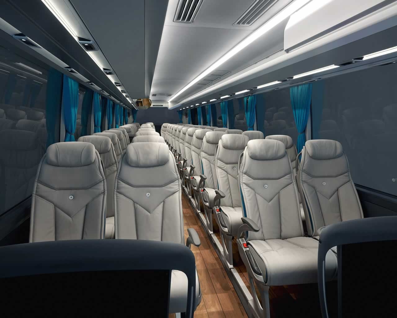 The full-sized coach bus rentals our network has to offer include some of the most popular brands on the market, including MERCEDES-BENZ, SETRA, MITSUBISHI-TEMSA, MAN, NEOPLAN and ISUZU. These brands offer a range of charter bus options for both private charter bus services and Tourist Bus services. Interiors and trim lines vary based on the model, but you can expect later-model motorcoaches to feature modern safety features and a clean bill of health before departing for your group transportation service. And with a professional bus driver at the wheel, your passengers can arrive at every destination with peace of mind!